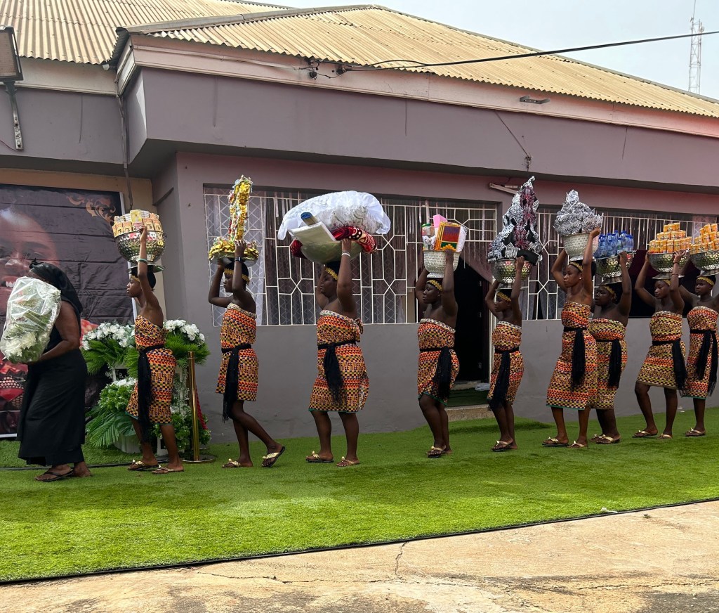 Akan funerals are successful if they are very well attended and if there is proper demonstration of utter devastation. It is for this reason that professional mourners (elderly women with skills to turn on the water works and roll on the floor) are sometimes hired to enhance the mood at the event. The morning session involved a lot of shaking hands, dancing and presentation of “gifts”. The gifts are a set of items purchased by the family to showcase the arrangements made to facilitate the journey to the afterlife. This is the only time I took pictures because I found this fascinating. Young girls dressed in traditional kente cloth carried the items in a basket on their heads. Each item was presented and explained to the audience by the MC of the event. It included large amounts of matchboxes, water, soft drinks, sweets, fabric, schnapps, and others. It was explained that my mother would not wander in the dark because she now had these matches to light her path; she would not thirst as we are sending her with water and soft drinks to hydrate her; she would have clothing; she would have a mat and some blankets for sleeping; sweets to energise her; etc.